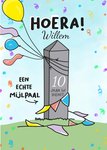 Kleurrijke werk jubileum kaart met de tekst: 'Hoera! Een echte mijlpaal. __ jaar in dienst'. Verras iemand met deze leuke werk jubileum kaart van Liefs Jansje.