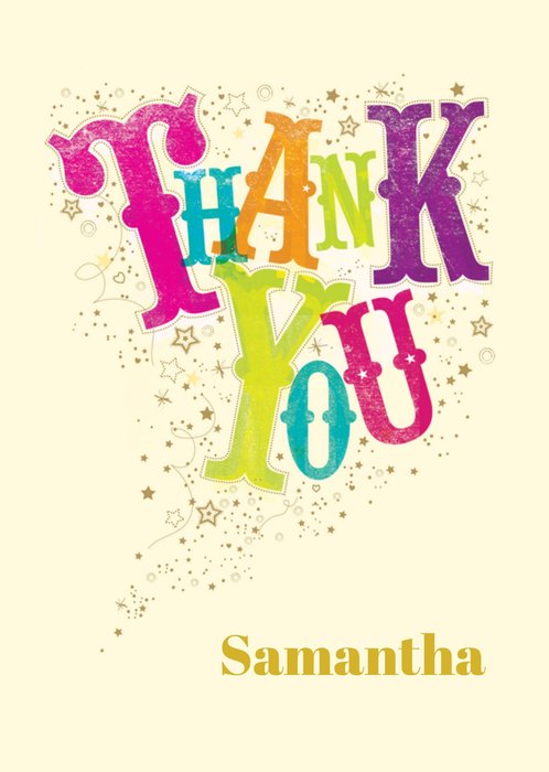 Kleurrijke bedankaart met aanpasbare naam.