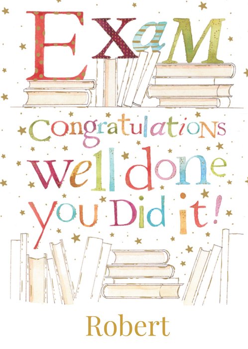 Leuke geslaagdkaart met aanpasbare naam en de tekst: Exam congratulations well done you did it!