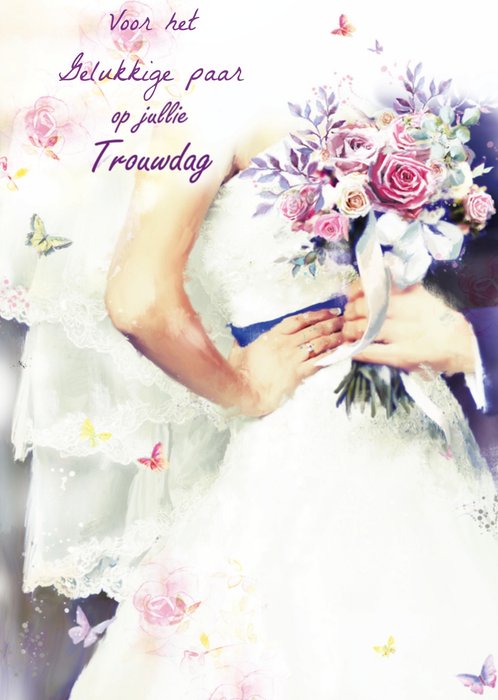 Vrolijke huwelijkskaart met illustratie en aanpasbare tekst.