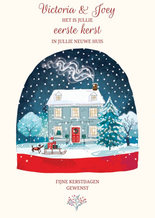 Wens een fijne Kerst met een leuke kerstkaart! Want je tovert gegarandeerd een glimlach op iemands gezicht met deze leuke kerstkaart. Op deze kaart staat een sneeuwbal met een huisje daarin en de tekst: [naam] het is jullie eerste kerst in jullie nieuwe huis. Fijne kerstdagen gewenst.