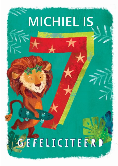 Vrolijke verjaardagskaart met leeuw en aanpasbare naam.