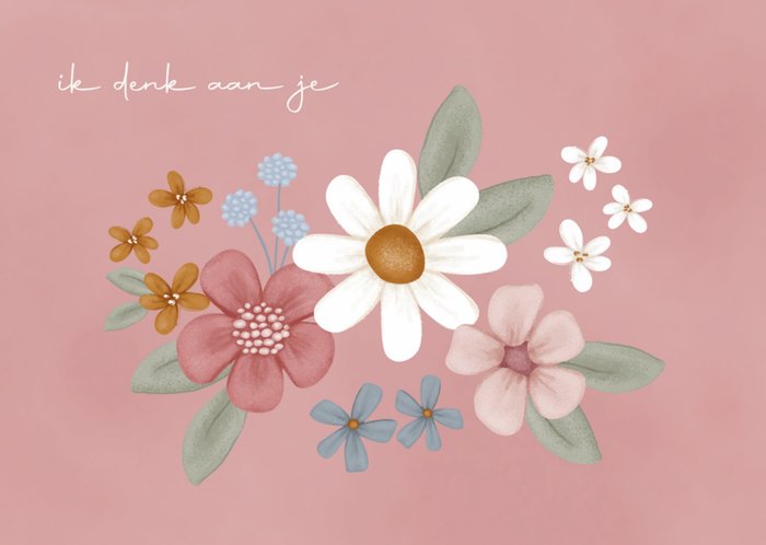 Lieve denken aan kaart met een roze achtergrond, illustraties van bloemen en de tekst: 'Ik denk aan je'. Laat iemand weten dat je aan haar denkt met deze mooie denken aan kaart van Little Dutch.