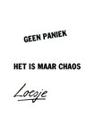 Minimalistische denken aan kaart met de tekst: 'Geen paniek het is maar chaos'. Laat iemand weten dat je aan haar denkt met deze typografische denken aan kaart van Loesje.
