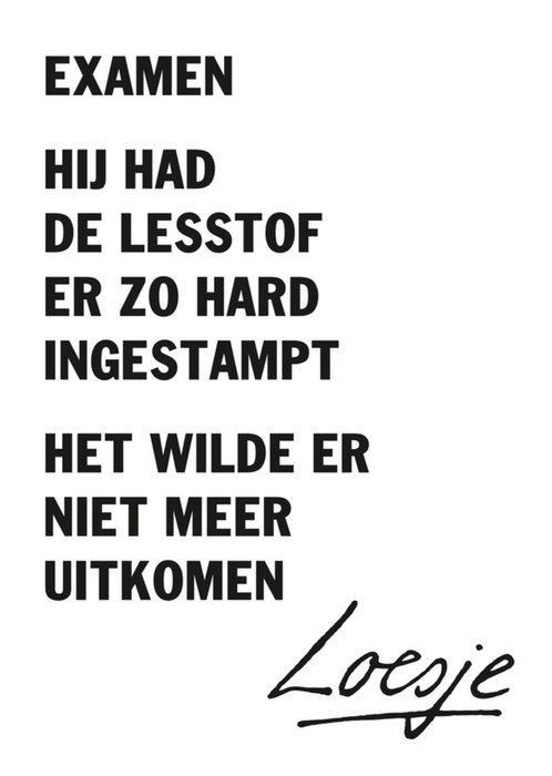 Grappige kaart van Loesje voor een examen en de tekst: Examen hij had de lesstof er zo hard ingestampt het wilde er niet meer uitkomen.