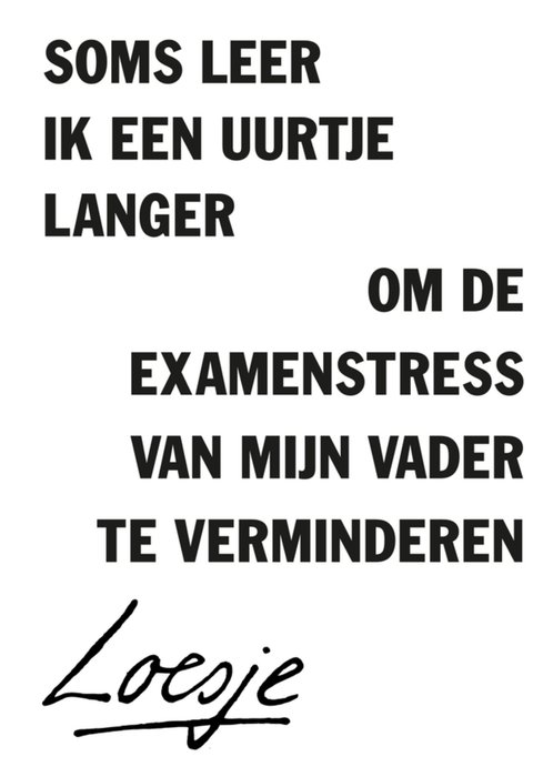 Ken je iemand die druk bezig is met zijn exame? Stuur hem dan deze grappige kaart van Loesje. Op de kaart staat de tekst: Soms leer ik een uurtje langer om de examenstress van mijn vader te verminderen.