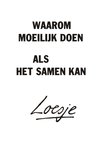 Witte wenskaart van Loesje, met op de voorkant een grappige spreuk: Waarom moeilijk doen als het samen kan.