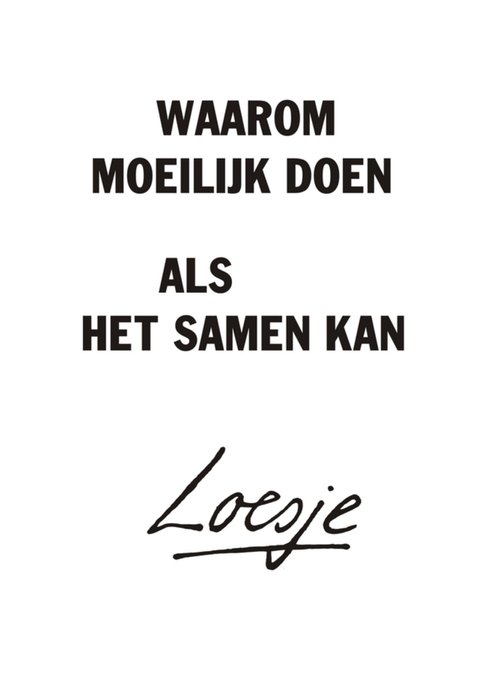 Witte wenskaart van Loesje, met op de voorkant een grappige spreuk: Waarom moeilijk doen als het samen kan.