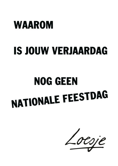 Minimalistische verjaardagskaart met de tekst: 'Waarom is jouw verjaardag nog geen nationale feestdag'. Verras iemand met deze typografische en grappige verjaardagskaart van Loesje.