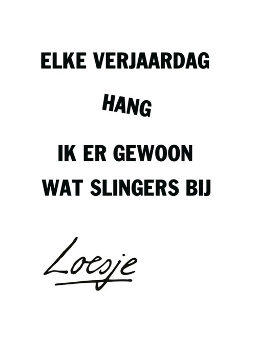 Minimalistische verjaardagskaart met de tekst: 'Elke verjaardag hang ik er gewoon wat slingers bij'. Verras iemand met deze typografische verjaardagskaart van Loesje.