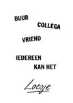 Loesje ken je vast van de posters. Loesje wilt je aan het lachen krijgen, of aan het denken zetten. Ze probeert de wereld op haar kop te zetten door af en toe haar gedachten op je los te laten. Ze wil kietelen, omdraaien en huppelen tegelijk, maar het liefst van al wil ze de wereld een beetje veranderen. Met een kaartje van Loesje ben jij ook een beetje Loesje. Je helpt haar om iemand aan het lachen te krijgen en zo de wereld een stuk mooier te maken.