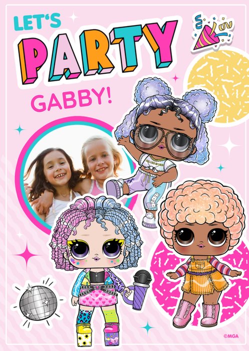 Kleurrijke verjaardagskaart met L.O.L dolls, aanpasbare foto en tekst: 'Let's Party.' Verras iemand met deze leuke verjaardagskaart van L.O.L Surprise en Danilo.