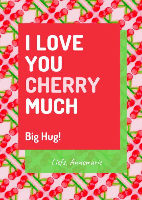 Vrolijke liefdeskaart met een kersen motief en de tekst; I love you cherry much. Big hug! Liefse, Annemarie. De naam op de kaart is aanpasbaar.