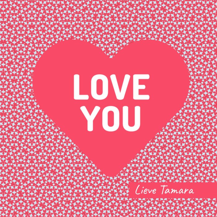 Liefdeskaart met een groot rood hart op de kaart met de tekst; Love you. Lieve Tamara. De naam op de kaart is aanpasbaar.