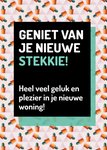 Leuke wenskaart met de tekst: Geniet van je nieuwe stekkie! Heel veel geluk en plezier in je nieuwe woning!
