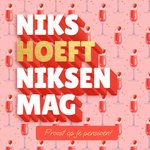 Leuke pensioen kaart voor een vrouw met hippe cocktailtjes op een roze achtergrond en een grote hippe grappige tekst: Niks hoeft. Niksen mag, proost op je pensioen.