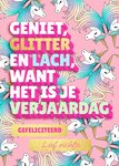 Is er binnenkort een meisje jarig en is ze dol op unicorns? Deze feestelijke roze verjaardagskaart met leuke glitter tekst is perfect als felicitatie voor de echte eenhoorn liefhebber. Met schattige unicorn illustraties en prachtige roze kleuren is deze verjaardagskaart perfect voor elke kleine jarige prinses.