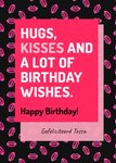 Verjaardagskaart met allemaal lipjes erop en de tekst; Hugs, kisses and a lot of birthday wishes. Happy Birthday! Gefeliciteerd Tessa. De naam op de kaart is aanpasbaar.