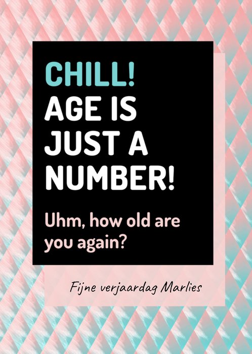 Leuke verjaardagskaart om iemand een fijne verjaardag mee te wensen met de tekst; Chill! Age is just a number! Uhm, how old are you again? Fijne verjaardag Marlies. De naam op de kaart is aanpasbaar.