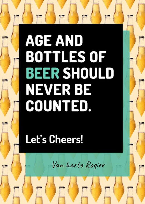 Verjaardagskaart met op de achtergrond van de kaart allemaal bier flesjes en de tekst; Age and bottles of beer should never be counted. Let's Cheers! Van harte Rogier. De naam op de kaart is aanpasbaar.