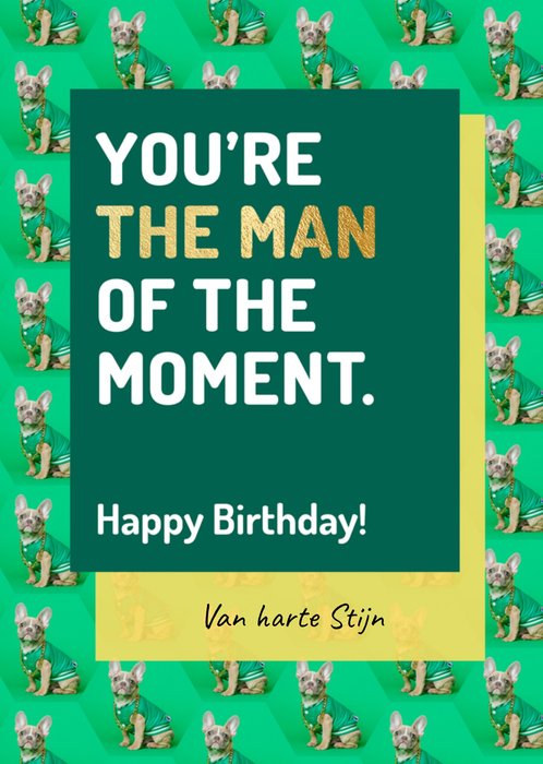 Verjaardagskaart met een super vrolijk patroon erop en de tekst; You're the man of the moment. Happy Birthday! Van harte Stijn. De naam op de kaart is aanpasbaar.