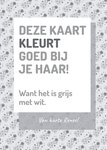 Grappige grijs met witte verjaardagskaart met daarop de tekst; Deze kaart kleurt goed bij je haar! Want het is grijs met wit. Van harte Renee! De naam op de kaart is aanpasbaar.