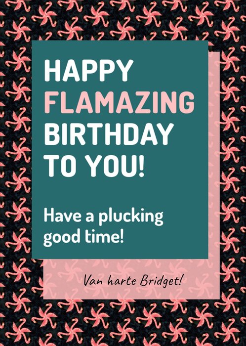 Verjaardagskaart met daarop allemaal flamingo's en de tekst; Happy flamazing birthday to you! Have a plucking god time! Van harte Bridget! De naam op de kaart is aanpasbaar.