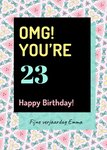 Verjaardagskaart om iemand een fijne verjaardag mee te wensen met de tekst; Omg! You're 23. Happy Birthday! Fijne verjaardag Emma. De naam en het getal op de kaart zijn aanpasbaar.