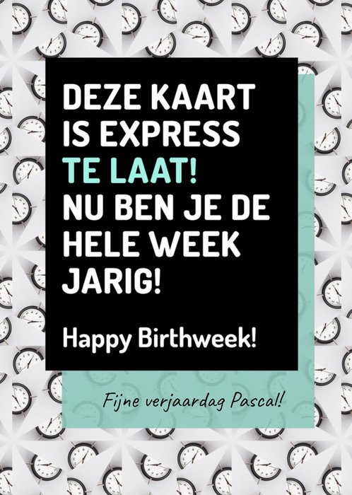 Mooie verjaardagskaart om iemand een fijne verjaardag mee te wensen met de tekst; Deze kaart is express te laat! Nu ben je de hele week jarig! Happy Birthweek! Fijne verjaardag Pascal! De naam op de kaart is aanpasbaar.