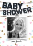 Vrolijke uitnodiging voor een baby shower met foto en naam. Versierd met stippen.