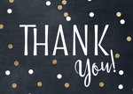 Wie ga jij bedanken met dit hippe bedankkaartje? De letters zijn wit en op de achtergrond zie je witte en gouden confetti.