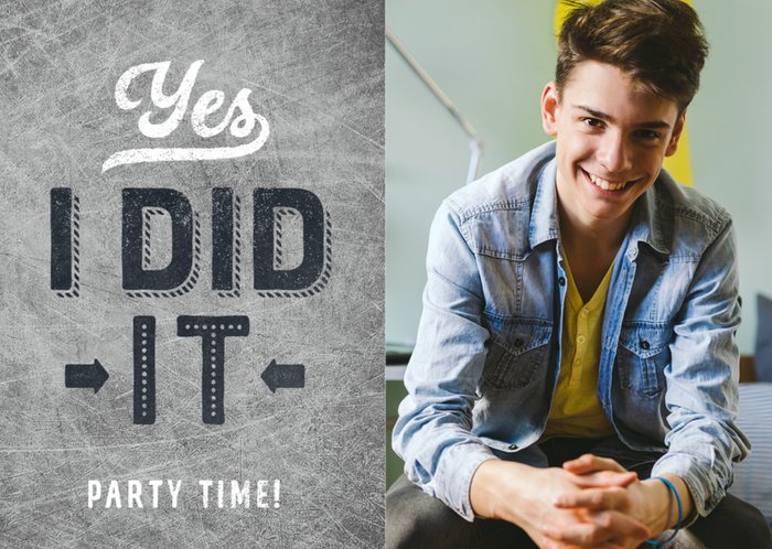 Geslaagd? Gefeliciteerd! Tijd voor een feestje! Nodig iedereen uit met deze uitnodiging. Voeg je eigen foto toe, pas de details aan en het feest kan beginnen!
