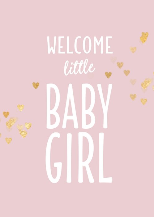 Verwelkom de kleine meid en feliciteer de kersverse ouders met de geboorte van hun dochter. Op de kaart staat de tekst: "Welcome little baby girl."