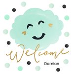 Feliciteer de kersverse ouders met hun kleine wondertje met deze lieve kaart. De naam op de kaart is aanpasbaar. Op de kaart zie je een vrolijk wolkje die lacht met de tekst: "Welcome."