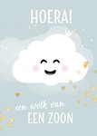 Feliciteer de kersverse ouders met hun wolk van een zoon met dit lieve kaartje. Op het kaartje staat een vrolijk wolkje met hartjes.