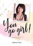 Wat goed! Jij kent iemand die geslaagd is. Stuur een leuk geslaagdkaartje van Luckz! Op deze kaart staat: You go girl! Gefeliciteerd [naam]. Ook kun je een foto toevoegen.