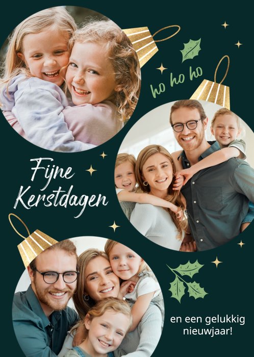 Vrolijke, fotocollage kerstkaart met drie kerstballen. Plaats je eigen foto en maak zo je unieke familie kerstkaarten. Wat zijn ze hip hè, de kaartjes van Luckz! Originele, persoonlijke kaarten voor ieder moment, die je eenvoudig kan aanpassen. Kenmerkend met een frisse, unieke stijl: trendy, stijlvol en stoer.