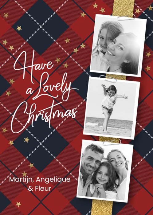Op deze kerstkaart van Luckz kun je verschillende foto's toevoegen en je naam. Ook staat er de tekst: Have a lovely Christmas.