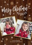 Knusse kerstgroet versturen? Dat doe je met deze foto-kerstkaart met houten achtergrond. Rondom de foto's en tekst staan witte en gouden sneeuwvlokjes afgedrukt. Je past trouwens ook gemakkelijk de namen onderaan de kerstkaart aan.