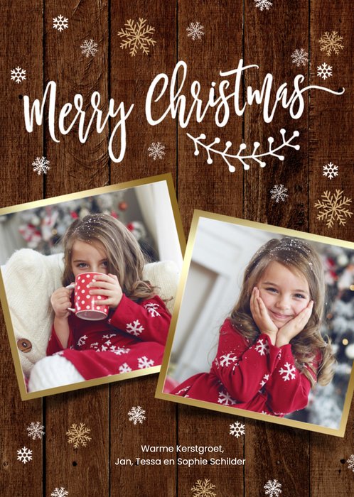 Knusse kerstgroet versturen? Dat doe je met deze foto-kerstkaart met houten achtergrond. Rondom de foto's en tekst staan witte en gouden sneeuwvlokjes afgedrukt. Je past trouwens ook gemakkelijk de namen onderaan de kerstkaart aan.