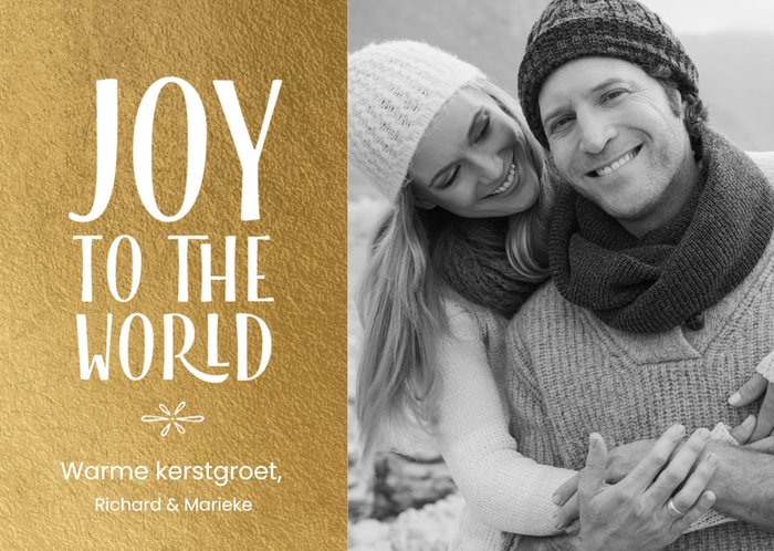 Breng 'Joy to the world' met deze persoonlijke kerstkaart met foto. De tekst staat in het gouden vlak en de naam is hierbij aanpasbaar.