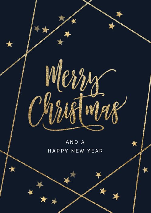 Wens vrienden en familie fijne feestdagen met een leuke kaart voor Kerst. Op deze kaart staat de tekst: Merry Christmas and a Happy New Year. Om de tekst heen zie je gouden sterretjes en lijntjes.