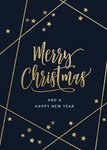 Wens vrienden en familie fijne feestdagen met een leuke kaart voor Kerst. Op deze kaart staat de tekst: Merry Christmas and a Happy New Year. Om de tekst heen zie je gouden sterretjes en lijntjes.