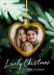 Persoonlijke kerstkaarten met foto in gouden hartvormige kerstbal. Warm, stijlvol en liefdevol met een Lovely Christmas wens. Wat zijn ze hip hè, de kaartjes van Luckz! Originele, persoonlijke kaarten voor ieder moment, die je eenvoudig kan aanpassen. Kenmerkend met een frisse, unieke stijl: trendy, stijlvol en stoer.