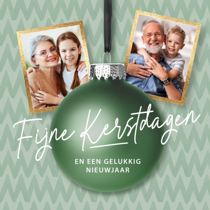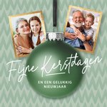 Originele kerstkaart met kerstbal en 2 foto’s voor een opa en oma.