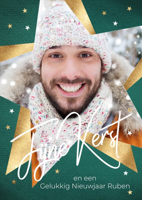 Feestelijke kerstkaart met foto in de vorm van een ster voor een man.