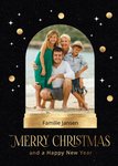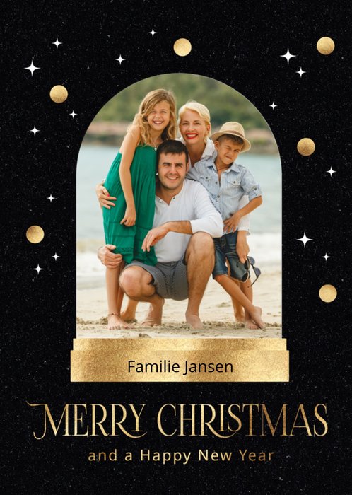 Kerstkaartje met sjieke gouden tekst, sterren en sneeuwbol op een zwarte achtergrond. Vervang de foto voor je eigen foto en maak je originele kerstkaart.