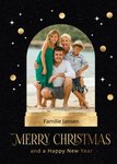 Kerstkaartje met sjieke gouden tekst, sterren en sneeuwbol op een zwarte achtergrond. Vervang de foto voor je eigen foto en maak je originele kerstkaart.