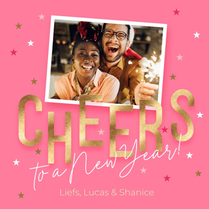 Cheers op het nieuwe jaar! Stuur al je vrienden en familie deze vrolijke, roze oud en nieuw kaart met foto en tekst.