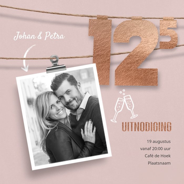 Mooie zacht roze huwelijksjubileum uitnodiging. Voeg jullie leukste, meest romantische of grappigste foto toe, pas de tekst aan en nodig iedereen uit voor een gezellig feestje.